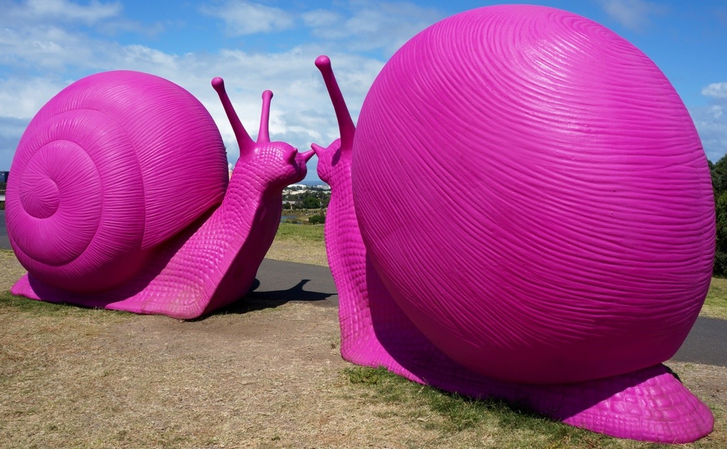 The snails are part of the Art and About Festival, more information is available from the ABC: Giant snails slide into Sydney for arts festival