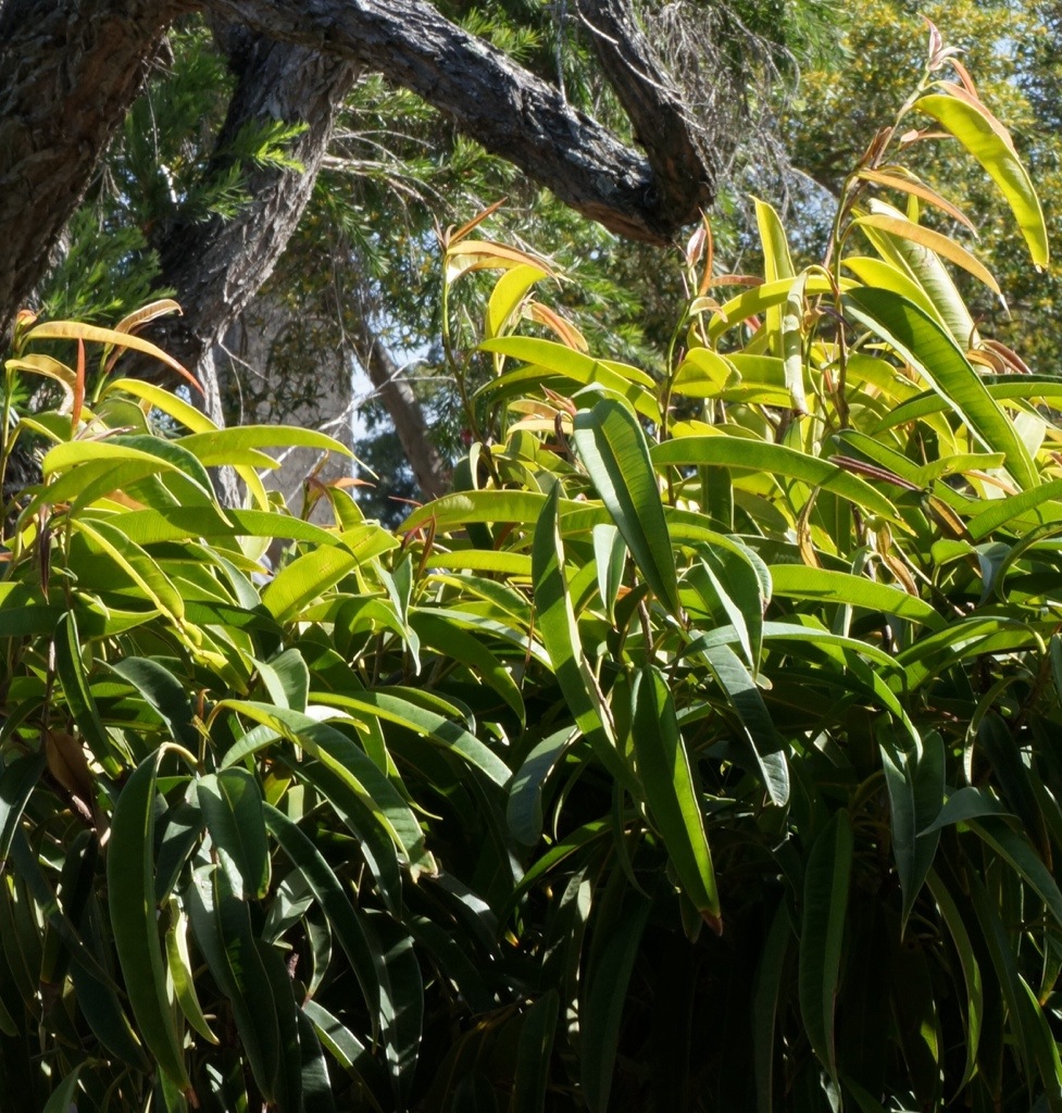 While enjoying the sunshine on the deck yesterday I noticed the way the light illuminated the various leaf colours of the Sabre or long leaf Ficus. I eagerly collected my camera so that I could capture the moment.