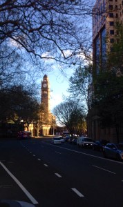 Afternoon sunlight illuminates the stone clock tower of Central railway Station.