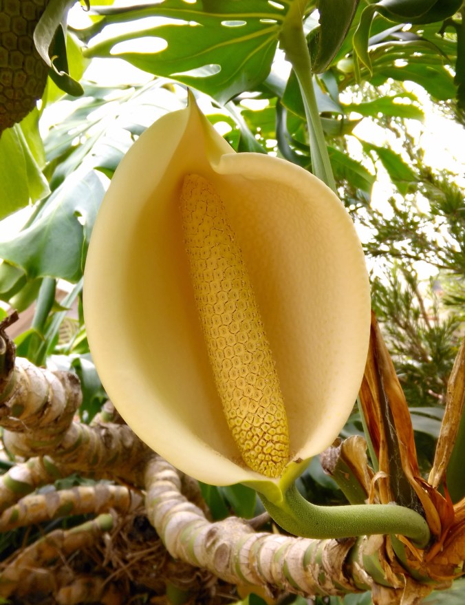 Aka Swiss Cheese plant from my youth spent in chilly England; these were house plants. It was not until I moved to Sydney that I first saw them flower and develop fruit that smelled like pineapple. You can see part of a fruit ripening in the top left of the picture.