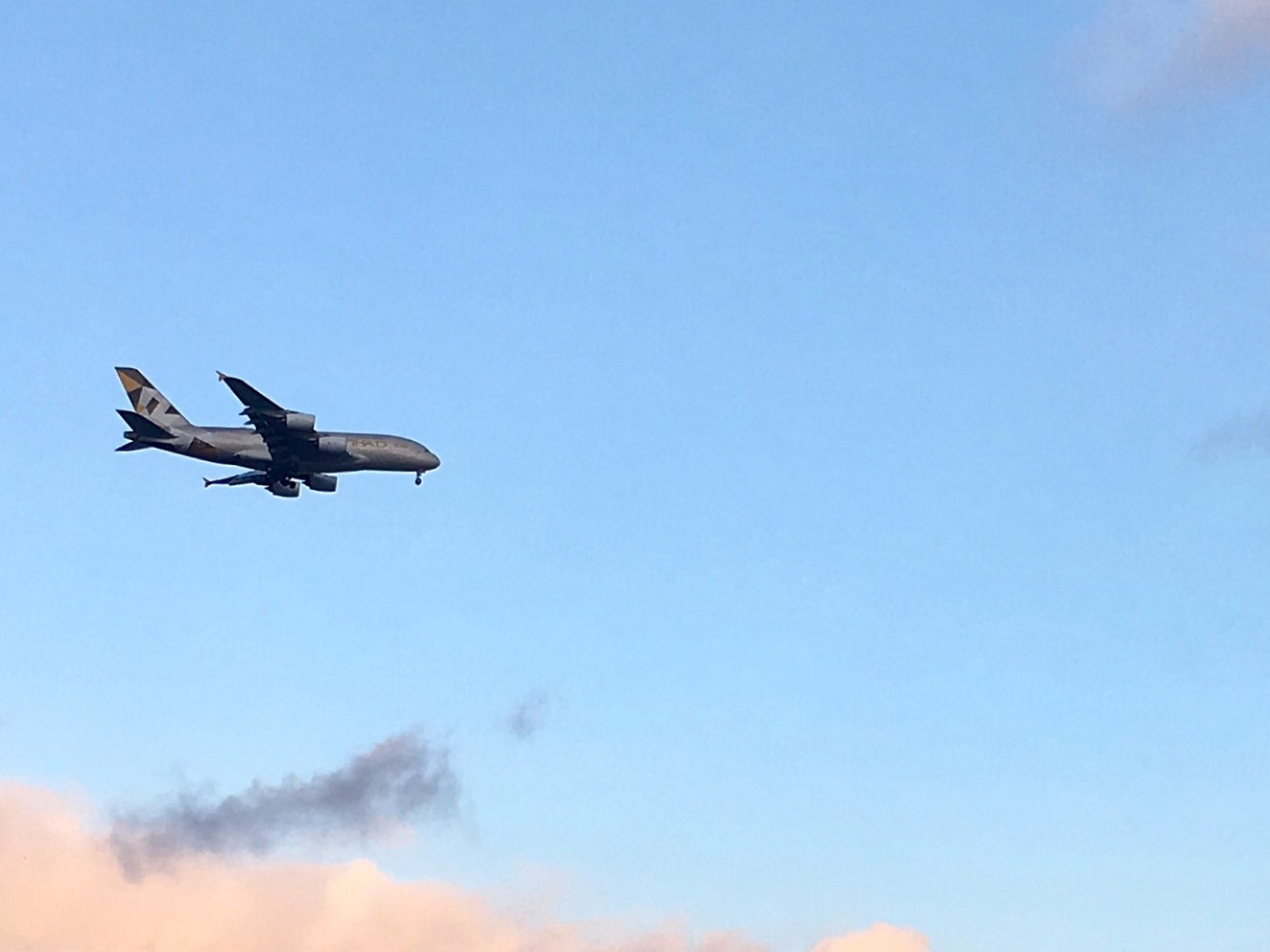 The Etihad flight above has its landing gear down. It is about 15 minutes away from the terminal building.