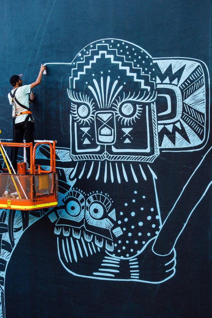 Curiot’s street art often depicts mythical creatures blended with animal and human forms. This mural portrays Aztec looking koalas sitting in a gum tree. It is featured in the top ten murals from public street art festival by Widewalls.