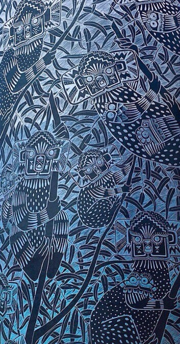 Curiot’s street art often depicts mythical creatures blended with animal and human forms. This mural portrays Aztec looking koalas sitting in a gum tree. It is featured in the top ten murals from public street art festival by Widewalls.