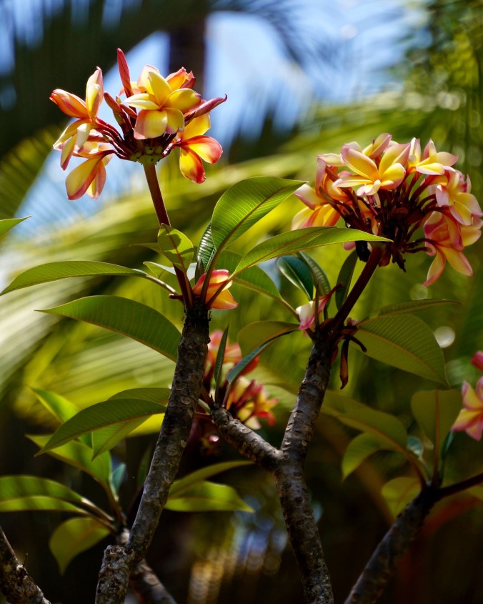 I am used to seeing dome shaped frangipani trees, in Sydney, with plump looking branches and a mass of long, sword shaped, leaves. This example in Port Douglas, Far North Queensland has produced gorgeous blooms, with few leaves and a totured looking trunk and branches.