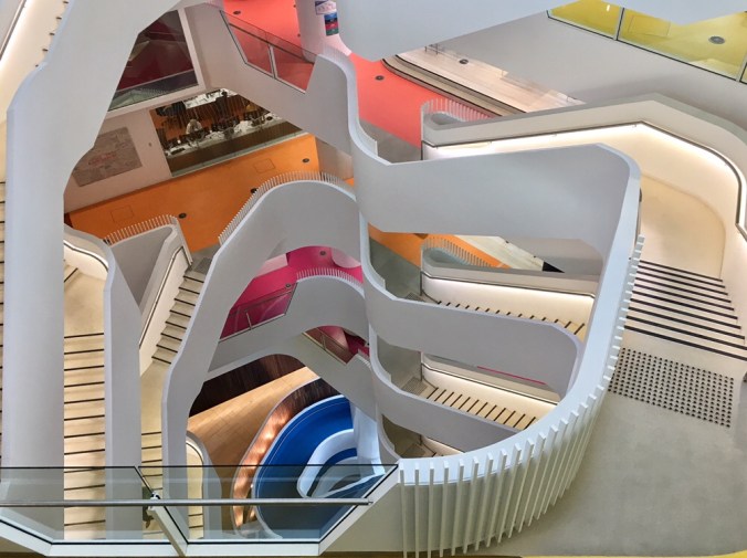 Wandering up the winding walkway, I wondered how the offices would be arranged. The view up through the middle of the atrium hinted at other colours.