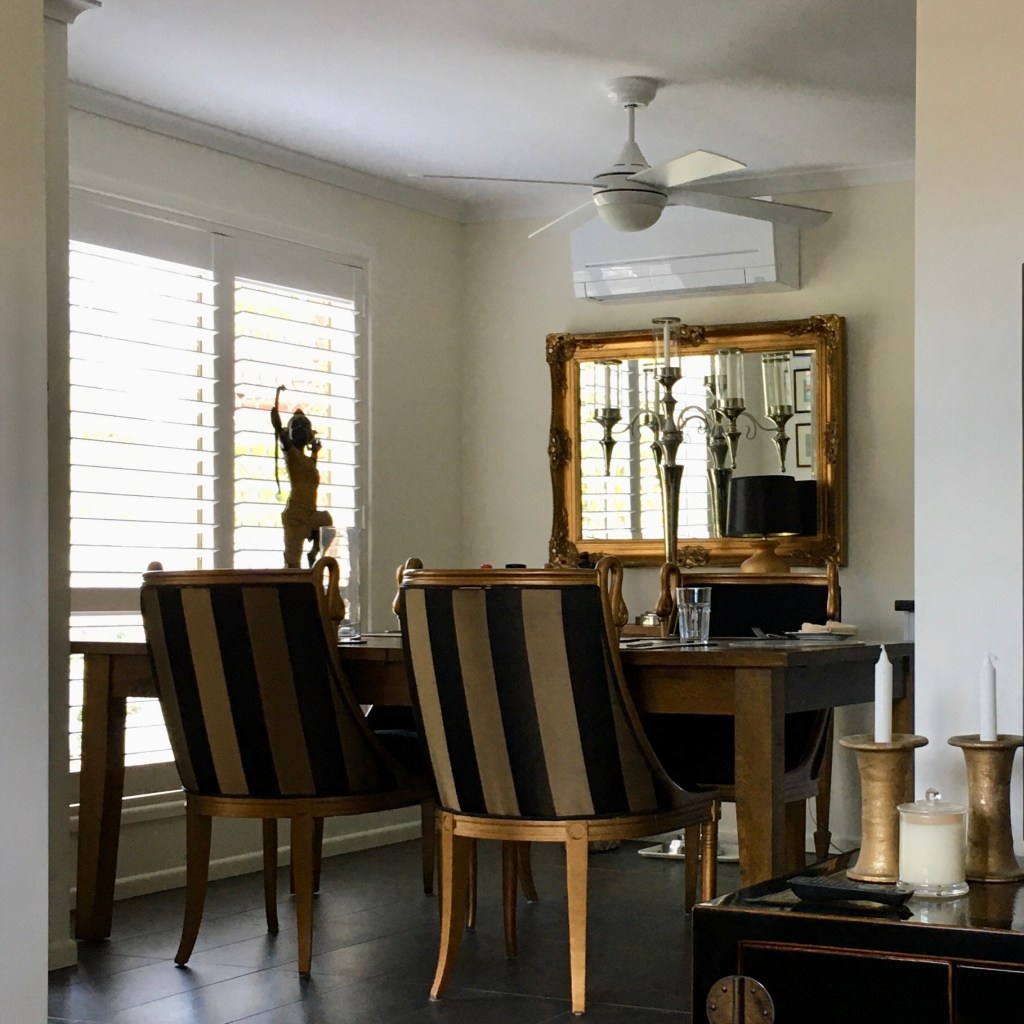We purchase the ‘swan’ chairs on a whim in 1999 from an over the top furniture shop on the fringe of Double Bay, Sydney. They have gold finished frames, Sensuede seats and Teflon coated French silk backs. Like most things in our life they have patina. Reminding us of happy gatherings of friends and family.