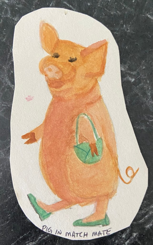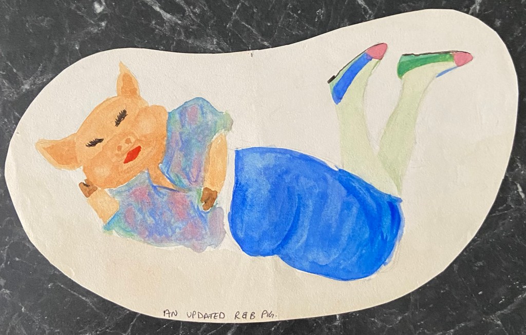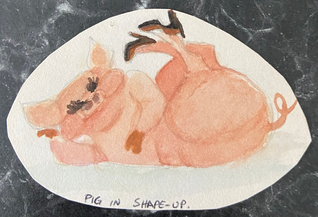 Tracey was hugely creative. During a quiet period, Tracey drew pencil sketches of pigs wearing R&B shoes on the back of Clarks packing labels. I was gifted with the sketches which I copied to paint corresponding watercolours.