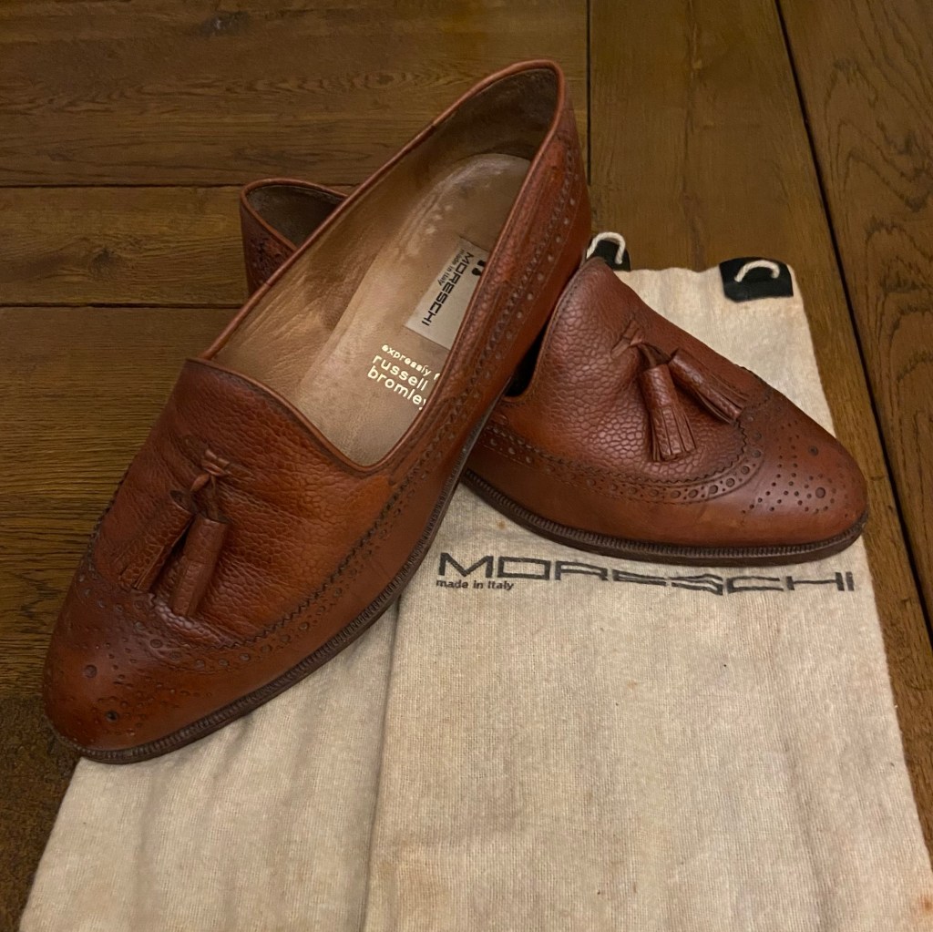 Fully utilising a 25% discount, my shoe collection grew to include leather soled and lined canvas shoes in two tone blue and in fawn; polished burgundy, black, dark brown, and dark fawn suede brogues, tan boxer boots, the list goes on. Only the Moreschis remain.