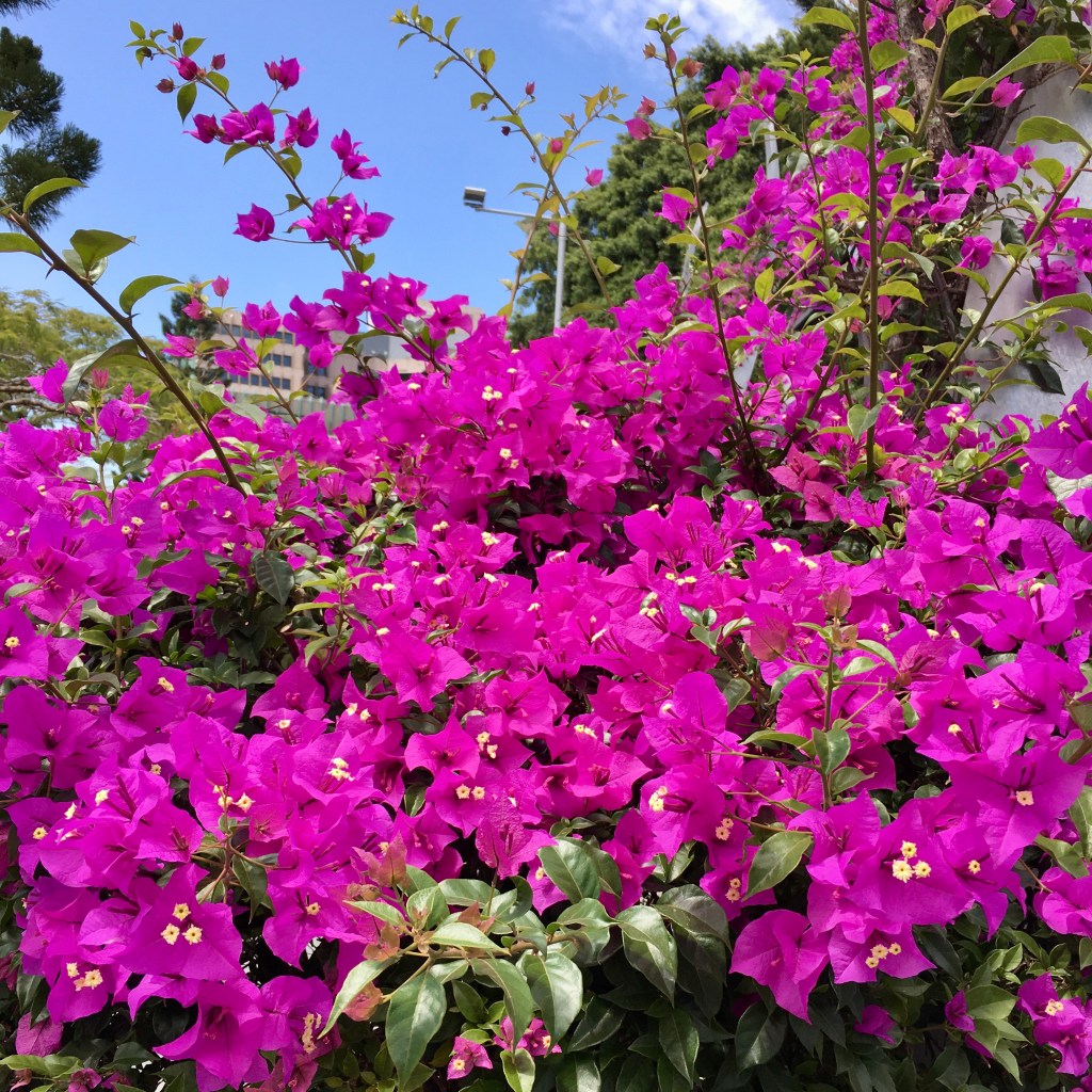 The serpentine bougainvillea arbour is in full bloom.