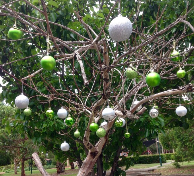 A dead tree on Norton Street adorned with baubles; jolly or macabre?