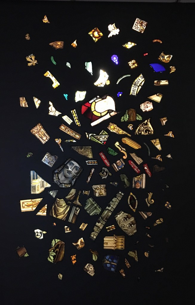 The above is installed in a temporary wall. When entering the one-man show one approaches the back (or is it the front) of the piece. There is a rough, torn out hole in the wall, pieces of plasterboard lie scattered and heaped on the floor. The structure of the wall and the lighting behind the stained glass can be viewed through the hole.