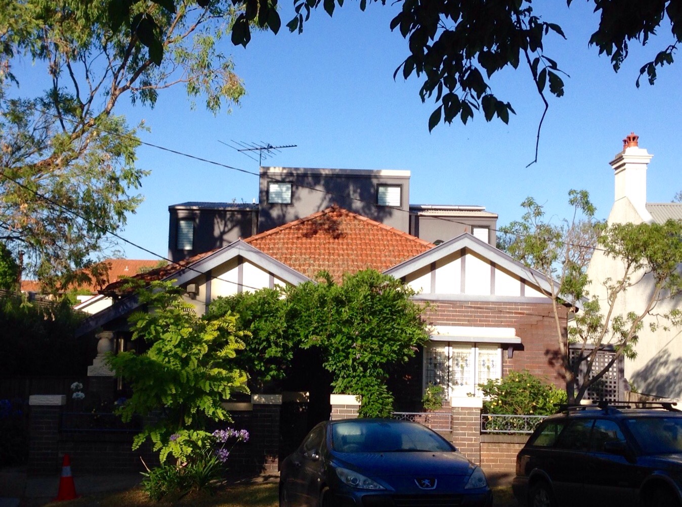 Early morning shadows in a picture perfect street in Leichhardt. This fine example of Federation domestic architecture appears at risk of being engulfed by it’s younger sibling. Passers by receive a blank stare from a grey cuboidal blockhead and shoulders as they rise from behind the terracotta roof.