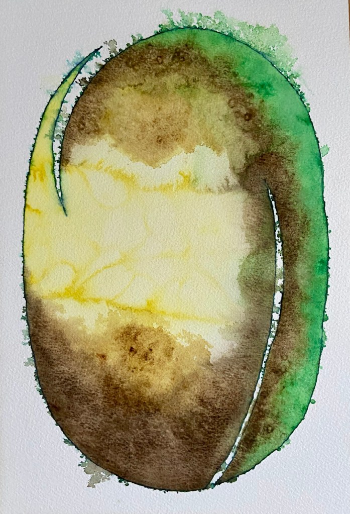 The original abstract abalone shell reflects my aim for an ‘ideal’ restrained and constrained abstract watercolour. The result evoked a meh response from me. Internally, I wrestled with the original is okay, I may make it worse if I do anything to it. Down the track, I would have earmarked it as a failure, turned the sheet over and painted on the back.