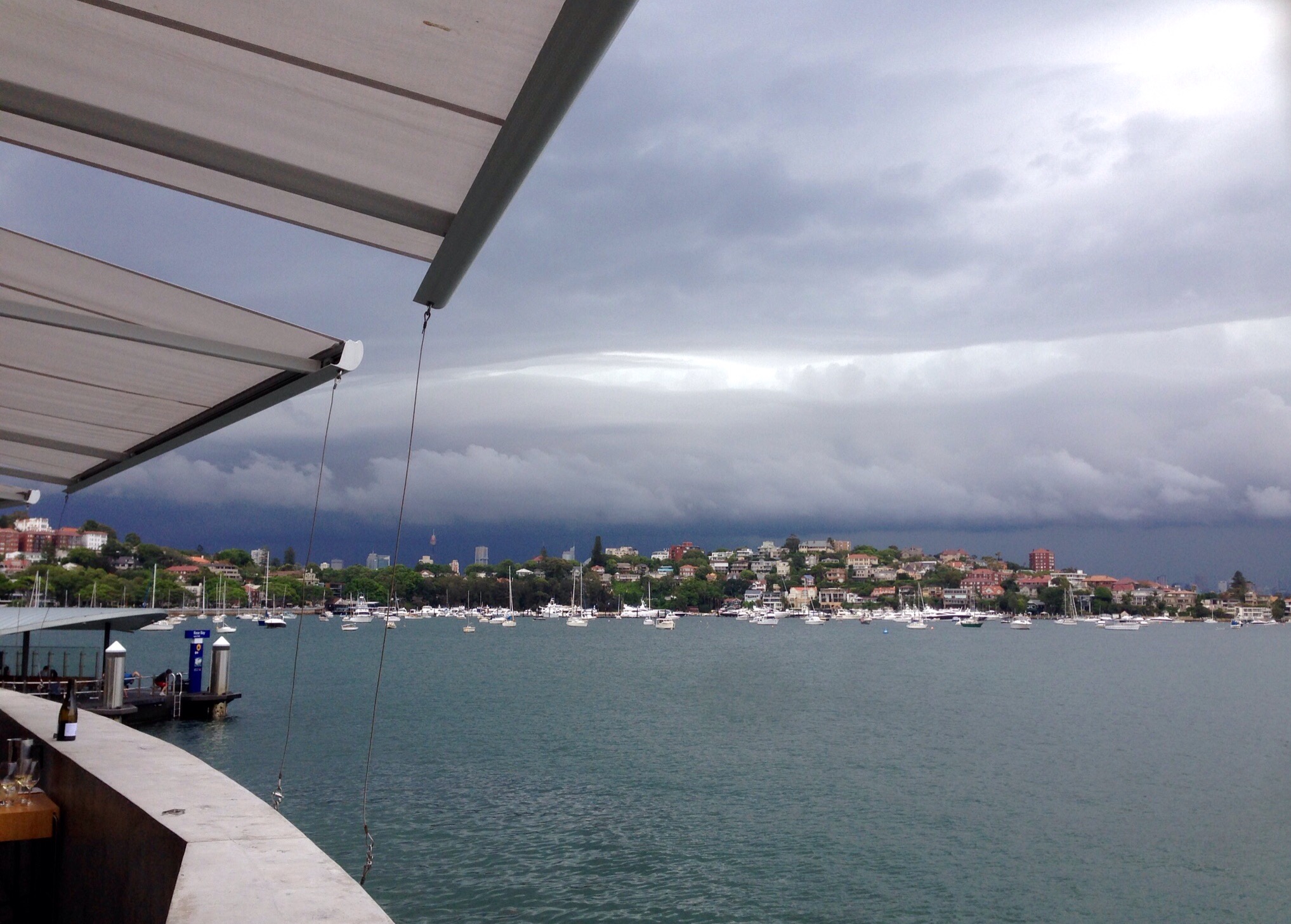 I attempted to capture the contrasting hues of the water and the sky in this picture. It was one of those moments when the sun catches the turquoise waters of Rose Bay, Sydney, NSW, Australia; meanwhile malevolent rain clouds gather overhead.
