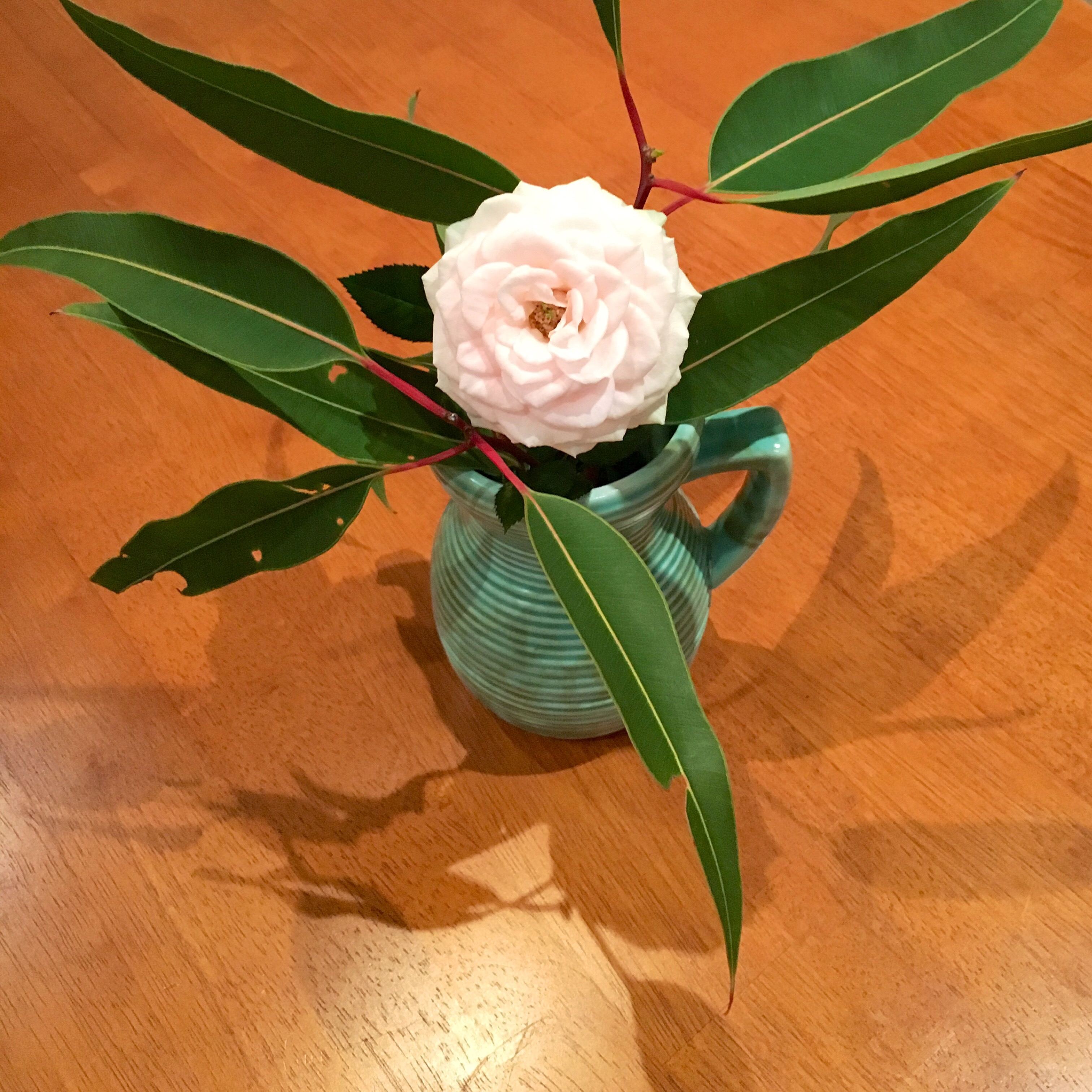 Peeping out from next to the hibernating Frangipani was a miniature blushing white bloom. With thanks to our wonderful next door neighbour the gum leaves complement the Spring rose beautifully.