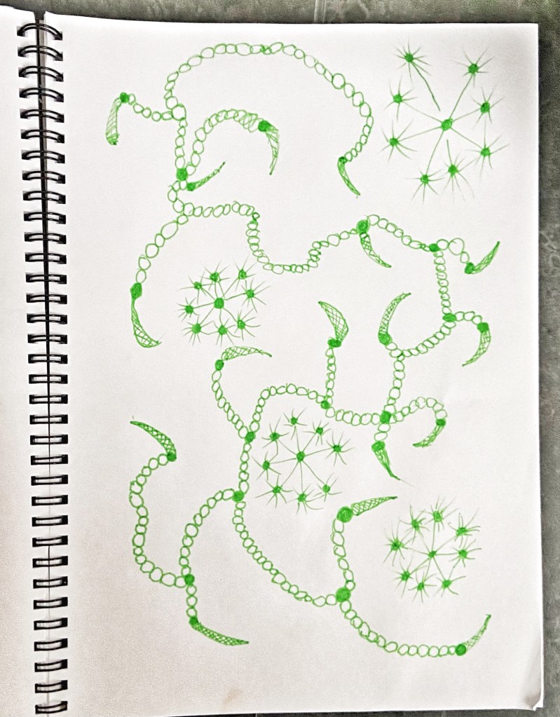 Snatching a few moments after lunch and before going in the spa, I used green ink to sketch bubble chains with knife or claw like weapons plus eight and ten pronged star shapes ending with more prongs or spikes.