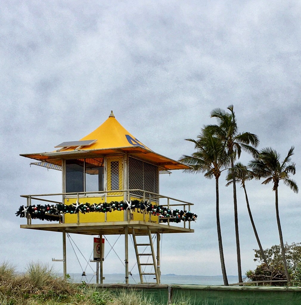This Antipodean surf lifesaver’s lookout on the Golf Coast is proudly showing off an artificial garland adorned with baubles and starfishes.