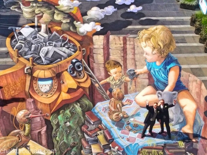 The night before our wedding in 2014 we walked past the proposed location of our wedding photos and found the area barriered off. At the same time we bumped into a former work colleague, Andi, who explained her new company was creating the amazing artwork. She explained it was a comment on the current political situation in Australia. The mechanical head spewing toxic liquid and consuming books was the then prime minister, Tony Abbott (who was always a NO to same sex marriage and even at the eleventh hour yesterday was trying to derail it). The toddler in the picture, based on Andi’s niece, was left with nothing but mechanical creatures as the ones in nature had been destroyed. A sad picture indeed.